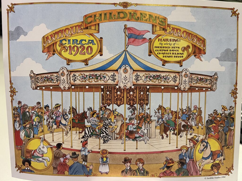 It features 20 hand-carved wooden animals, including work by master carvers Gustave Bayol, Freidrich Heyn, Henri Devos, and M.C. Illions.